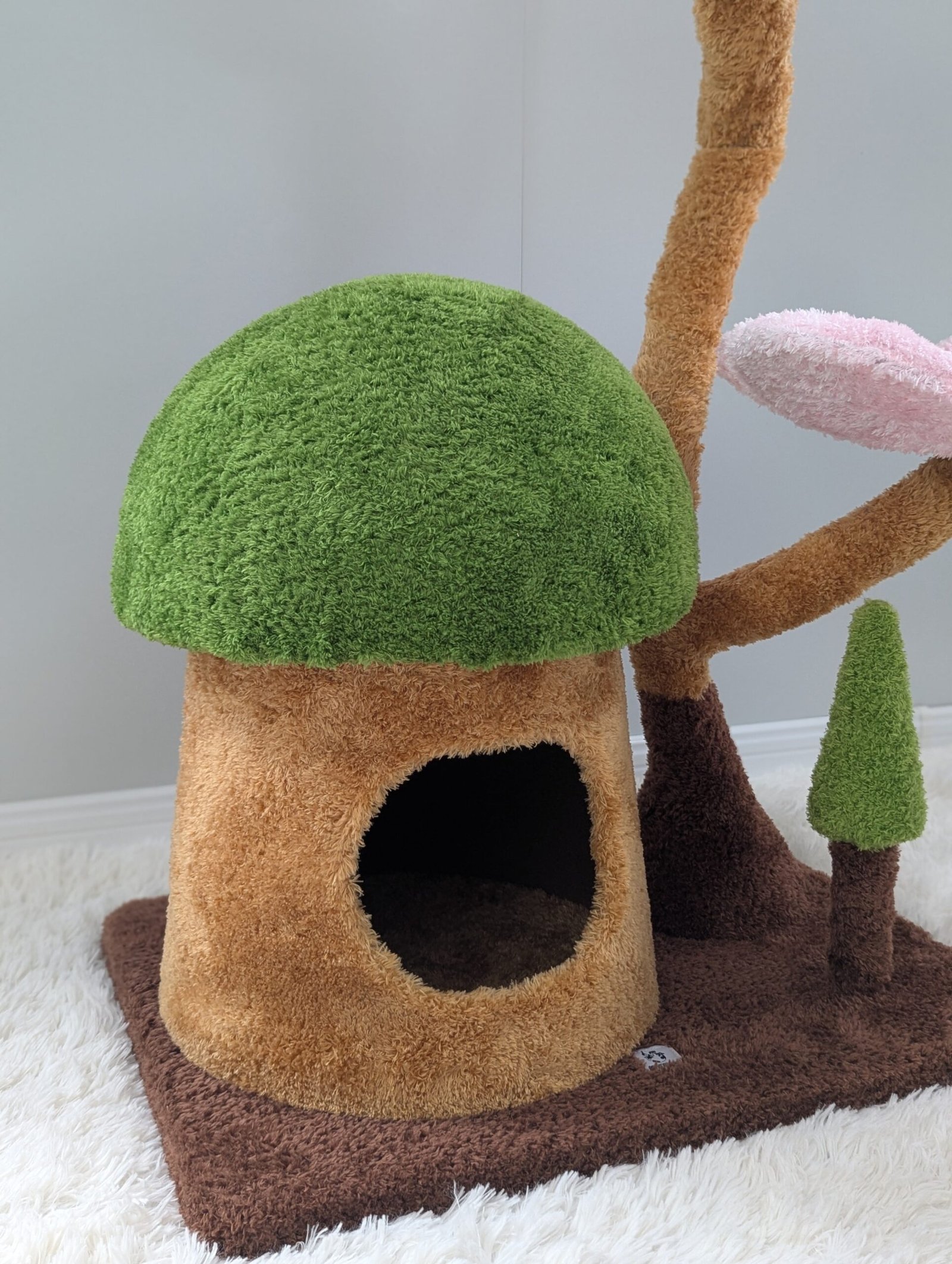 🍄 Gombaházikó: Az alsó részen egy zárt, zöld kalapos gombára emlékeztető búvóhely található, amely biztosítja a cica számára a nyugodt visszavonulás lehetőségét.